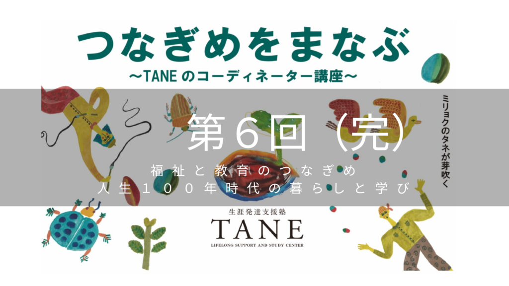 今回のテーマは壮大。この講座を考えたときに、なんとなく仮テーマにしていたのだが、最終的にぜんぶしっくりいく流れになってる(と、我々は思っている)のです。考えたときはまだコロナなんて騒がれてなくて、まさかの展開になりました。人生100年時代といっていいのか、あるいはコロナの時代とかいうのか、とにかくこの「いま」をどうやって生きていくかを、暮らし(福祉)と学び(教育)から考えていこうと思います。