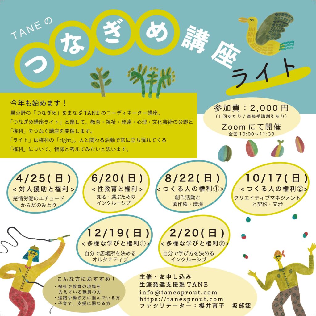 そこで今回は、「つなぎめ講座ライト」と題して、教育・福祉・発達・心理・文化芸術の分野と「権利」をつなぐ講座を開催します。「ライト」は権利の「right」。人と関わる活動で常に立ち現れてくる「権利」について、皆様と考えてみたいと思います。