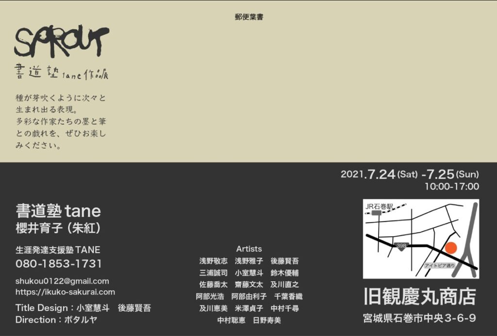 作品を作るというよりは、それぞれの個性に合わせて「書くことそのものの楽しさ」を味わうライブを毎回行ってきた場なので、「書道展」をするというイメージが全くできないままでした。でも、昨年末の旧観慶丸商店のまちかどギャラリーの小さな展示がきっかけで、やはり「見てもらう」ことの嬉しさを知りました。