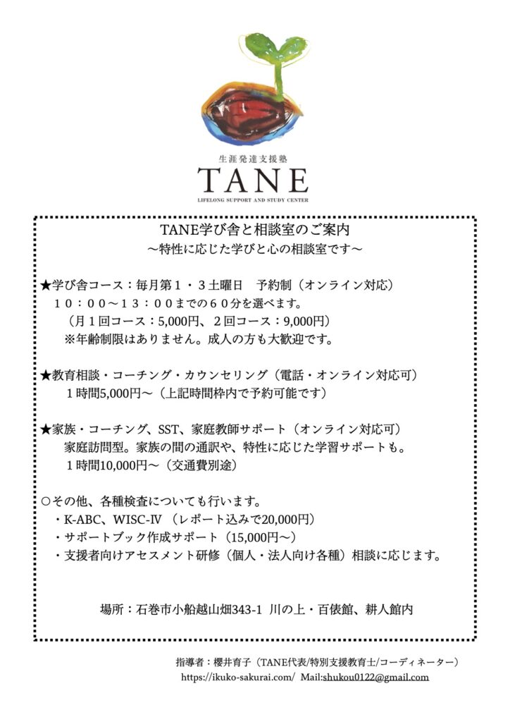 TANE相談室は9月26日(日)に、10:30〜12:00で開いております。ご相談がある場合には予約制にて承ります。