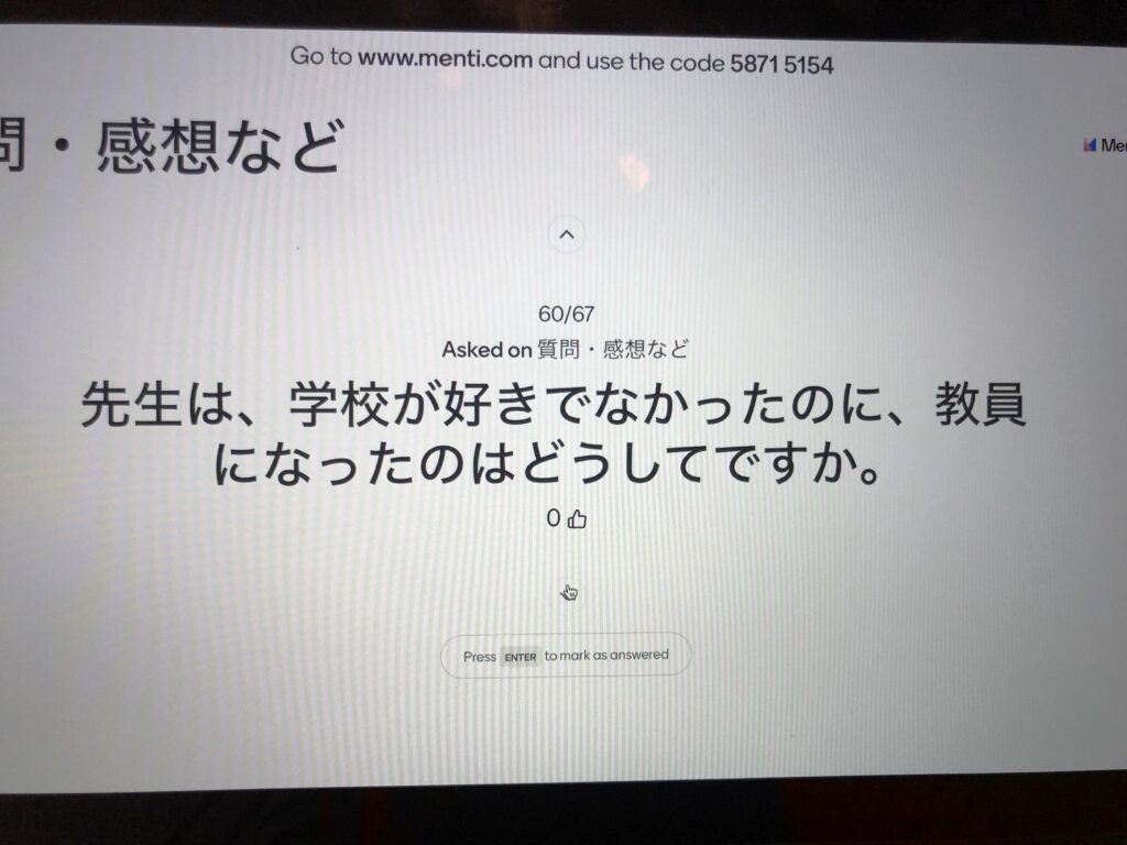 今回の研修でも、「mentimeter」というサイトを使って質問を集めてみたところ、こんな質問がきていて、時間がなくて答えられなかったのでここで質問に答えてみようと思う。