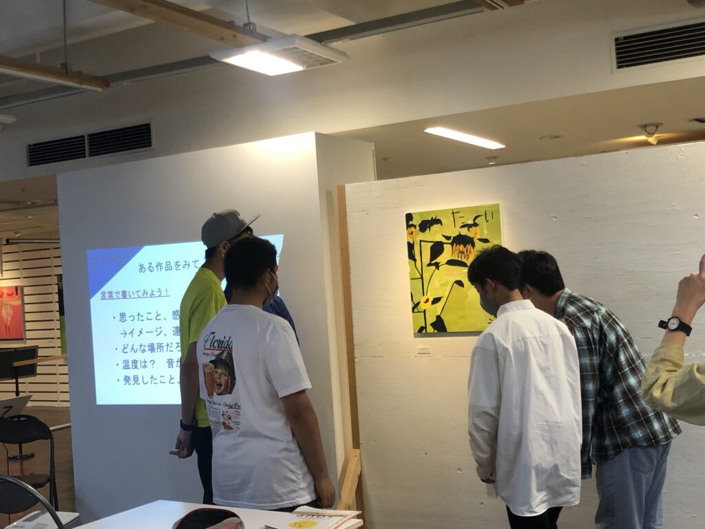 まずは、事前学習で行ってきた、①自分の好きなこと、②将来の夢や願い、なりたい自分、③卒業したらやってみたいこと、チャレンジしたいこと、④平日の楽しみ方(仕事の後)、⑤休日の楽しみ方、⑥長期休暇の楽しみ方、についてスライドにまとめてきたみなさんの発表を聞く。なんとみなさん、一人ずつパワーポイントに自分たちでまとめてきたとか!その堂々とした発表にわたしたちもひたすら感心するばかり。そして、エイブルアートジャパンのみなさんに聞きたいことのコーナーでは、「卒業したら頼っていいですか?」「どんなことができますか?」「どういう思いの人が来ていますか?」「これから目指したいことは?」などと深い質問までが飛び出す。