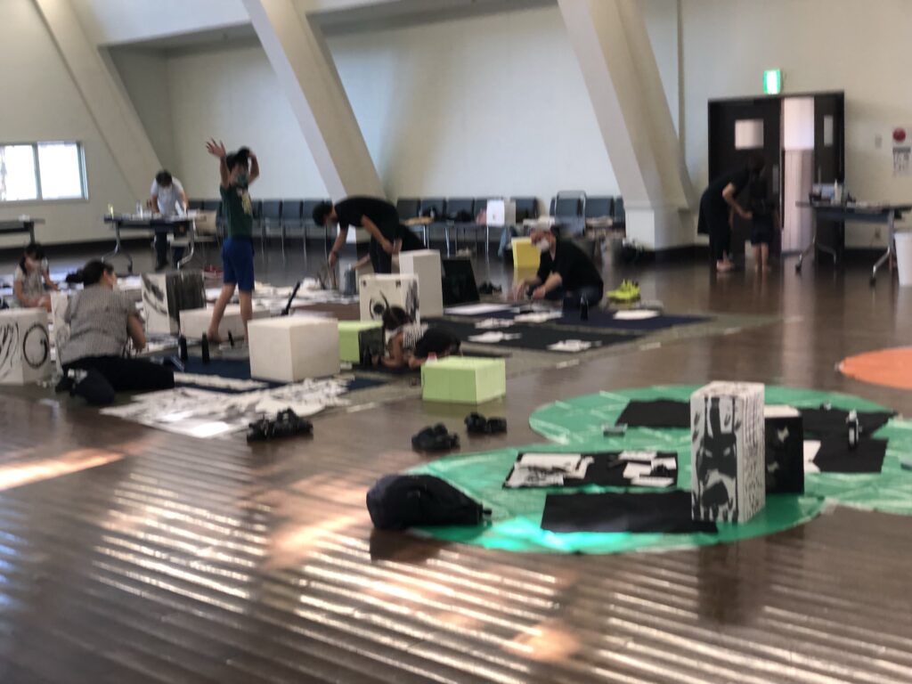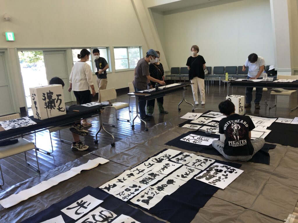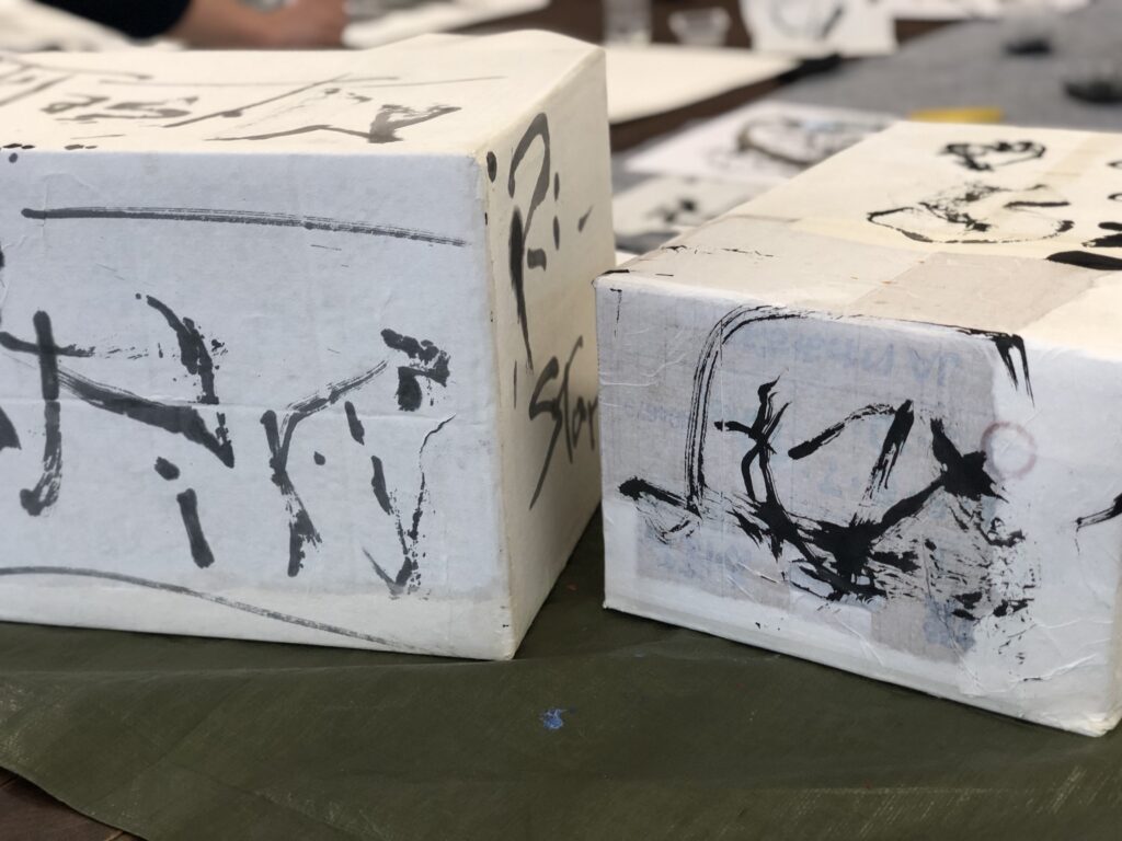 素敵な不思議なご縁で、塩竈市杉村惇美術館の大講堂でのワークショップを開催できることになった。正直なところ、ここまで大きな会場で行ったのははじめて。今回は、立体に書いてみよう!ということもあり、箱作りなどは美術館のスタッフの方に作成していただいた。できるだけ、さまざまな人が来ればいいなあ、子どもも大人も、年齢層もバラバラだったら面白いなあ、と思って当日、ほんとうに多様なメンバーが、「書きたい」「書は久しぶり!」「調子に乗りたい」「のびのびしたい」「はじめてでドキドキ!」「おもしろそう」などと、目的も多様で、ふんわりと集まってくださった。