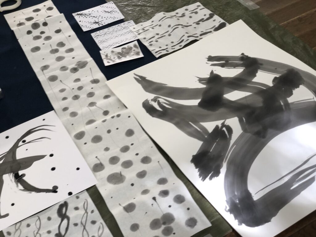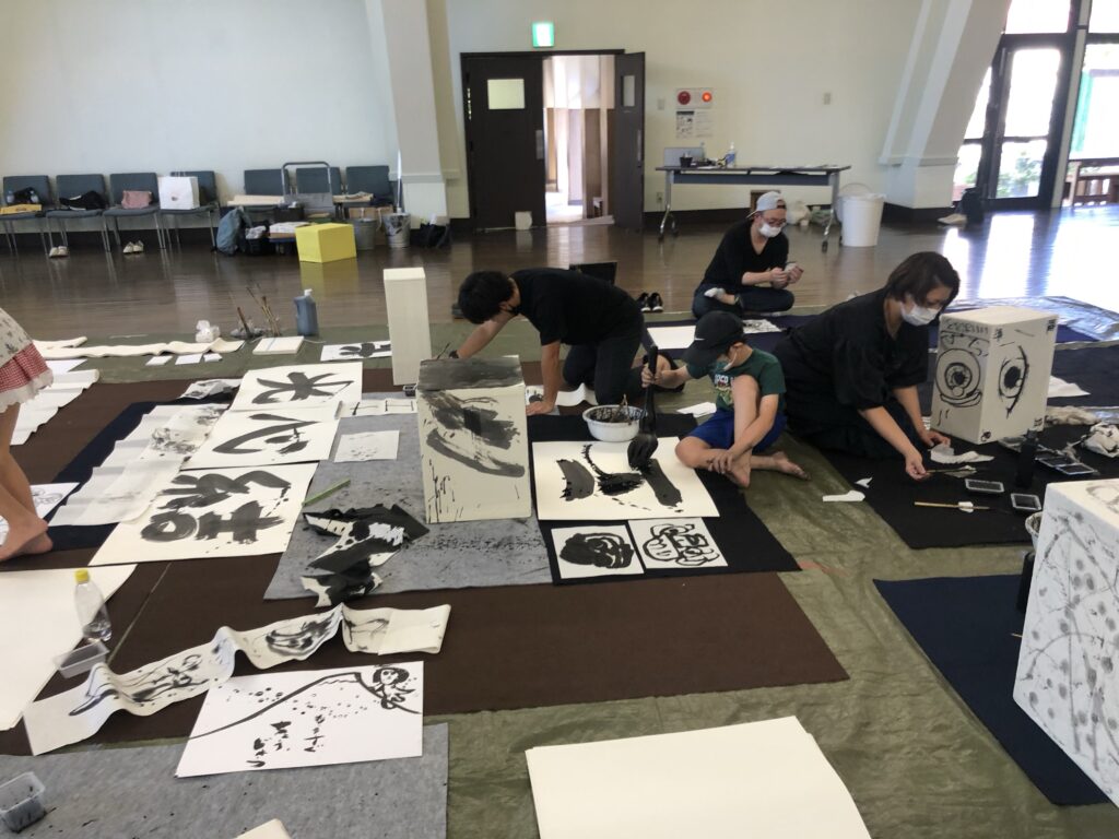 ところが、入ってくるなり、落ち着きのある大講堂に吸い込まれるかのように、それぞれのペースでのびのびと制作が始まっていく。心理学用語に「アフォーダンス」という言葉がある。用具や、配置は、制作が集中できるようにしておいた。つい書きたくなる環境、というやつだ。子どもたちがのびのびと書く様子に惹かれるように、大人も書く。いつもの書道塾に来てくれているメンバーの存在も大きい。彼らがどんどん集中しているから、集中が連鎖する。こっちも書いてみたい。手足につけて書いてる子がいるよ、わたしもやりたい。やってみよう。次はこれ。