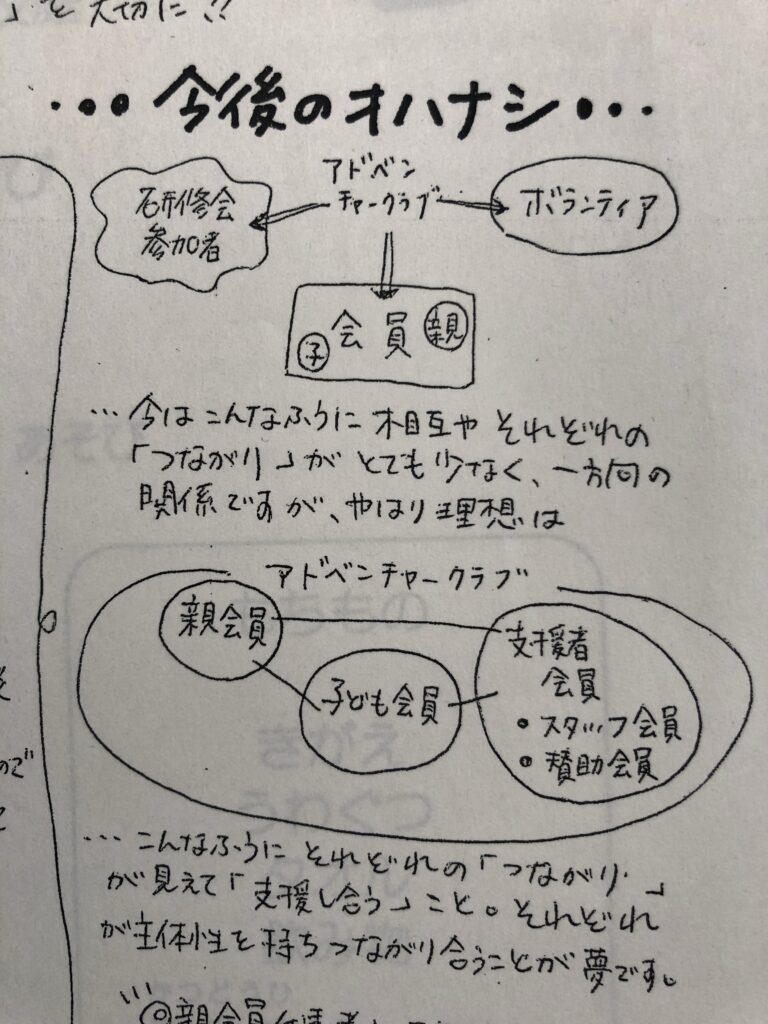 アドベンチャークラブを立ち上げたのは、子どもたちのためだけではなかったことを、あらためてこの通信を見て思う。小さく書いてあるが、「研修会参加者」というのは、支援学校を会場にして行っていたアセスメント研究会だ。今思えばいい時代。土曜日の支援学校を会場にして、心理検査や発達検査を学ぶ会を当時の教務の先生と一緒に立ち上げた。参加者は地域の先生たちや、支援学校の先生たち。そして、こうした熱意ある先生たちがアドベンチャークラブのスタッフとして、彼らの特性をそのまま理解していったら、こんなに素敵なことはないと思っていた。