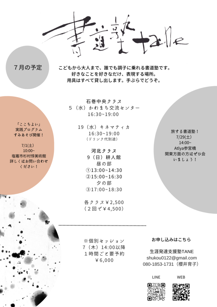しかし夏も楽しまなくてはということで今月ももりだくさん。OTONA書道はないのですが、耕人館「夕の部」の新設、塩釜でのオープンワークショップ(美術館企画)、東京のアトリア参宮橋での旅する書道塾、などちょっと移動も多くなります。