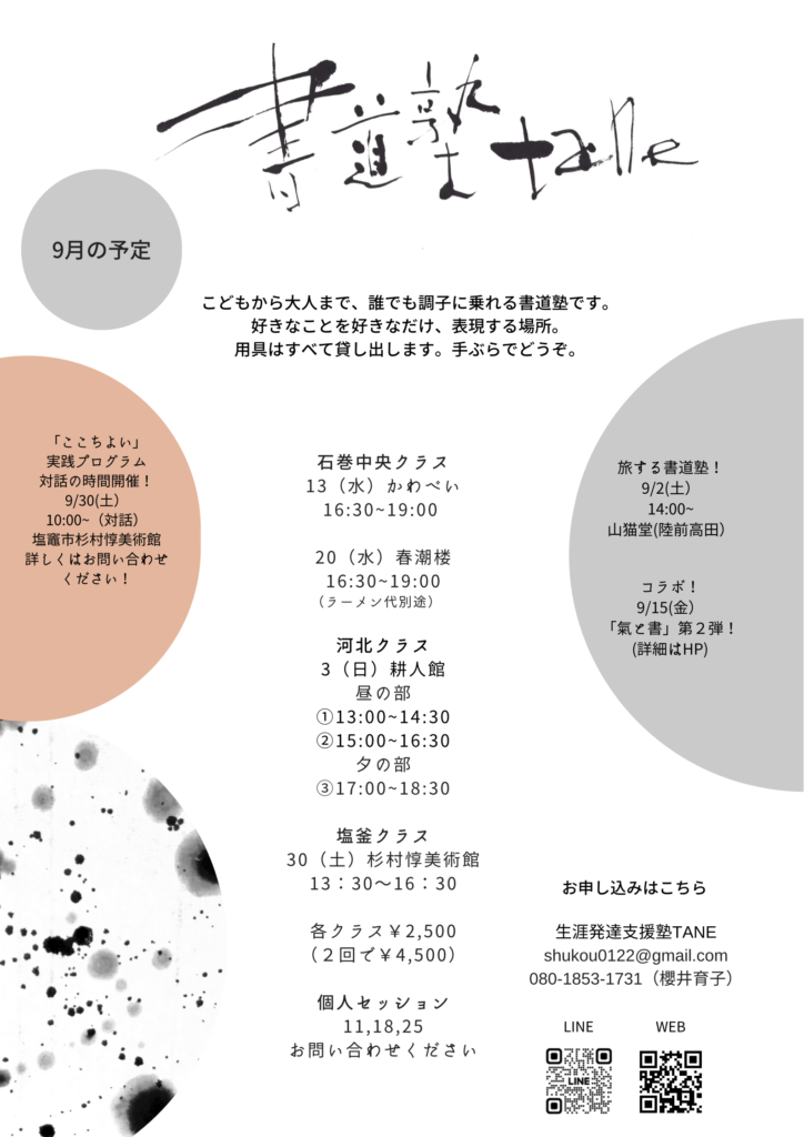 本当に暑い夏でしたね。まだまだ涼しくなりそうもありません。9月の予定、いろんなコラボイベント、旅する書道塾、またまた盛りだくさんです。