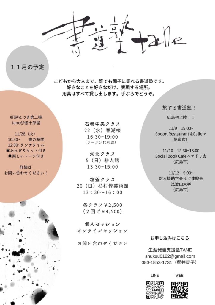 2016年に「違いは魅力」をテーマとして、生涯発達支援塾TANEを開始。書道と生涯発達の研究の場である「書道塾tane」を全国各地で開催。