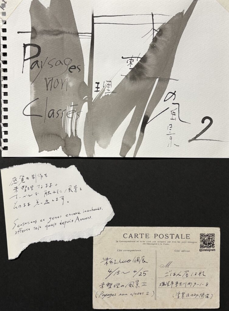 本展では、2026年3月にフランス・オーベルシュルオワーズでの滞在制作および、小学生約300名とのワークショップ実践を通して得た感覚や、現地で書いたり遊んだりした、まだ未整理の作品を中心に展示します。